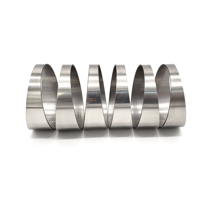 This set of polished 304 Stainless Pie Cuts has an outside diameter of 1.625", a wall thickness of 0.059", and a centerline radius (CLR) of 1.625" (1D). Our Stainless Pie Cuts are sold as a 6 piece set, each piece cut to an overall angle of 15°, for a total bend angle of 90°.